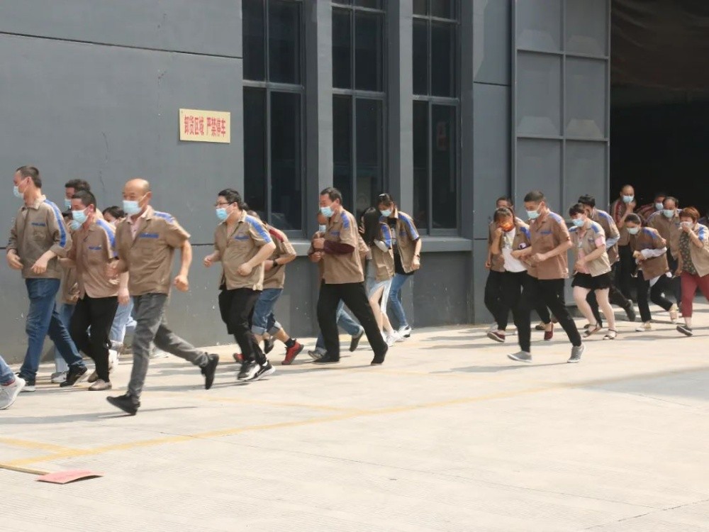 經過周密安排,上午9時,一陣急促的火警警報聲拉開了“消防疏散演練”活動的帷幕,聽到警報聲,各車間主任立即到達指定崗位,指導員工快速疏散,員工們彎著腰、貓著步,捂住口鼻,沿著指定安全出口快速前進,有序安全撤離到廠區內的緊急集合點。