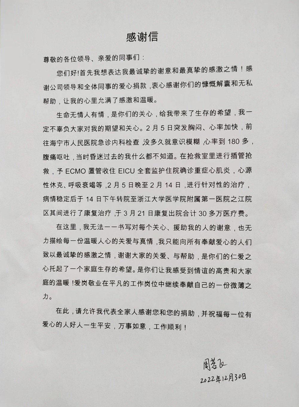 今年年初,周若飛突發重癥心肌炎,經過一個多月的搶救和手術治療,最終挺過難關,但花費了一筆很大的醫療費用,自費費用近20萬元,給家庭造成了較大的經濟壓力。為此,集團員工關愛互助基金解員工之憂,按基金會章程規定,給予了周若飛頂級的醫療救助金。
