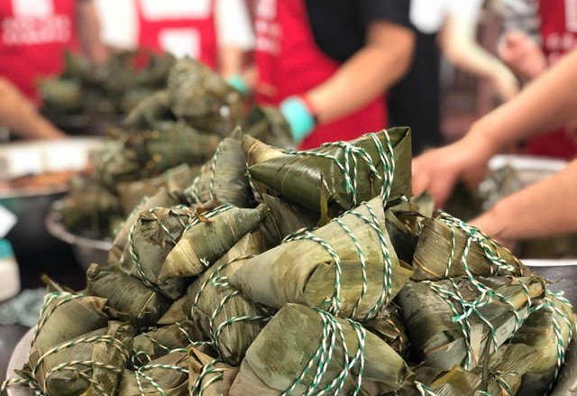 當然中間也有不少前來學習的員工,瞧,集團黨委周書記正親自授課呢!大家在各位老師傅的帶領下,由生到熟、由笨到巧,這粽子也是越包越好看了。